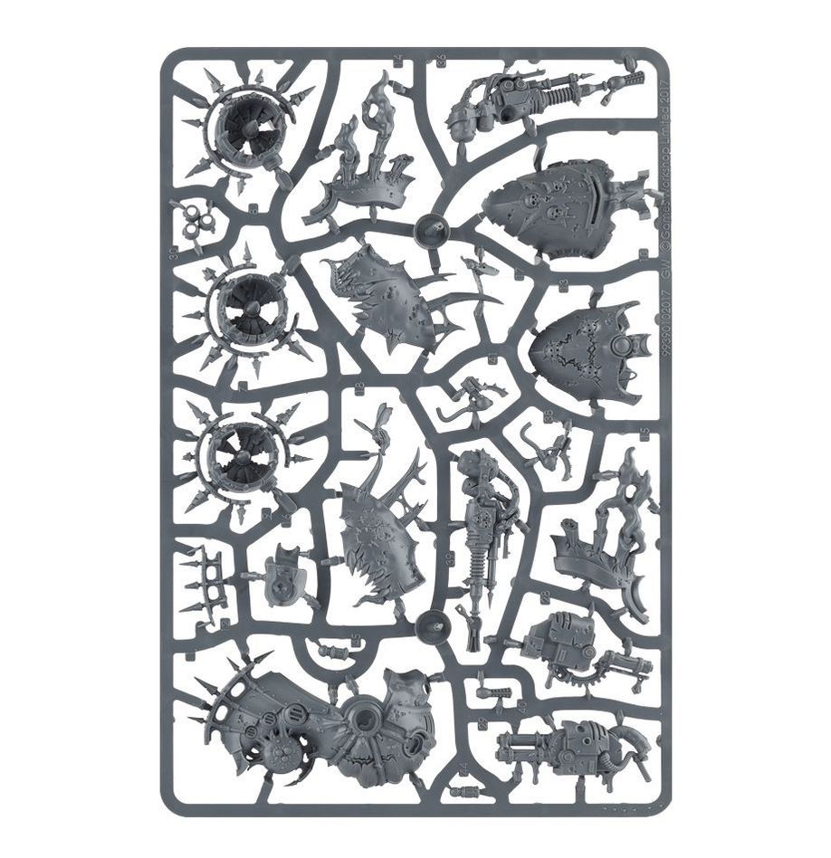 This multi-part plastic kit contains the components necessary to assemble a Foetid Bloat-drone. A huge, intimidating amalgamation of machine and rotting meat, the front of the model is dominated by a carapace which can be assembled as 1 of 3 options – one featuring a Nurgle symbol picked out in skulls, one featuring the symbol carved into the carapace, and one featuring a hideous toothed maw covered in pustules, tentacles and hoses dangling from within. It comes armed with 2 plague spitters and a plague probe; whichever carapace you pick, the plague spitters can be replaced with either a heavy blight launcher or a flesh mower (which looks as utterly ghastly as it sounds…) The back of the model is a riot of horrendous detail, with obscenely stretched skin spilling over the metal structures that barely contain it