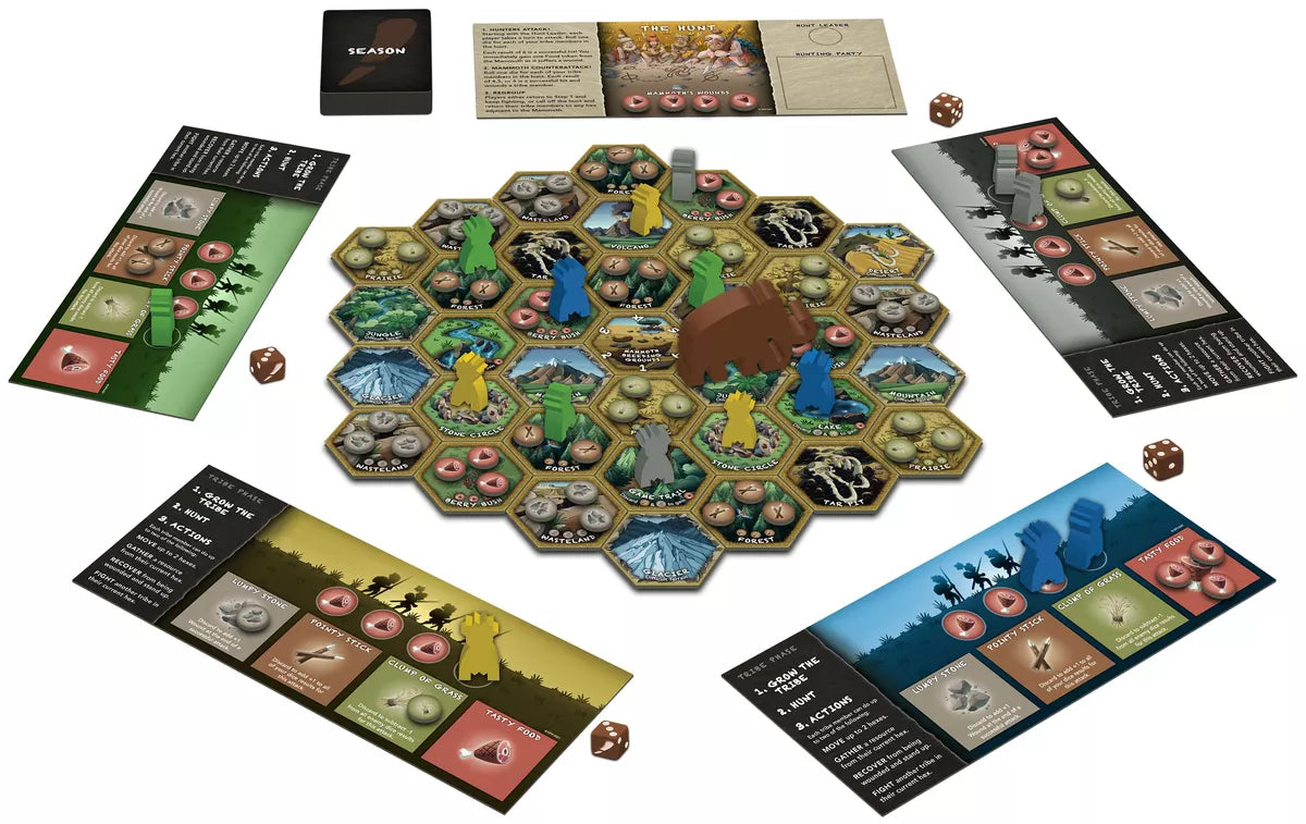 In Tusk!, you and your fellow players will need to team up to hunt successfully — but there can be only one master of the hunt, and to ensure that's you and your tribe, you need to manipulate alliances, horde supplies, and make use of the land's many resources to become the most powerful tribe. The game ends when snow covers the entire playing area, and the tribe with the most food wins!